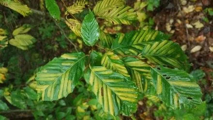 Symptoms: Dark banding or striping between leaf veins (best seen in spring/summer), shriveled/deformed leaves, reduced leaf size, and progressive crown thinning. Can lead to tree death over several years.