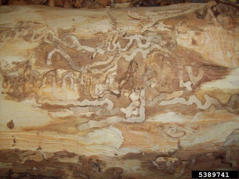 Symptoms: D-shaped exit holes (about 3–4 mm) in the bark, serpentine larval galleries under the bark, crown thinning/dieback starting at the top, epicormic shoots (sprouts on trunk), and woodpecker activity. Trees can die within 2–4 years.