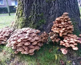 Symptoms: Gradual decline, thin crowns, yellowing foliage, resin flow or cracks at base. Clusters of honey-colored mushrooms in fall. White mycelial fans under bark.